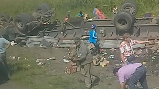 Un camión con mercadería dio un vuelco y dejó su carga desparramada y los vecinos y eventuales transeúntes no dudaron en acercarse hasta el vehículo que quedó al costado de la ruta y llevarse todos los paquetes que pudieran llevarse entre sus brazos. Fuentes policiales informaron que se desconocen las causas del hecho ya que no intervino un segundo vehículo.