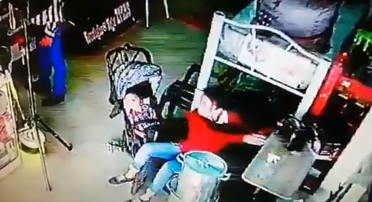 En el audiovisual, se logra ver cómo las tres personas ingresan al recinto, la mujer, se sienta en un banco y al ver el descuido de la vendedora, saca un parlante que estaba colocado sobre el mostrador y lo esconde en la parte trasera del accesorio para trasladar al niño.