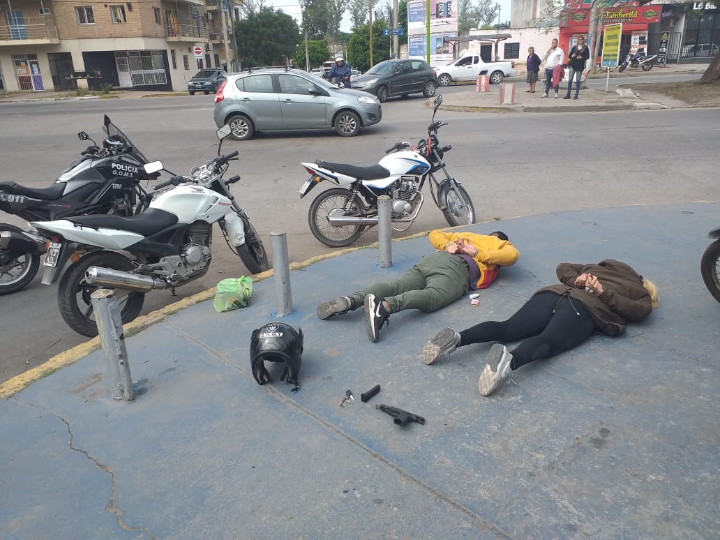 Un video llegado a la redacción de TucSinFiltro da cuenta de ese instante mientras una mujer registra las imágenes de ese momento le dice a otra persona, la potencial víctima de la pareja de motochorros: “Chau…gracias a Dios no te pasó nada…cuidate mucho”. En tanto, uno de los policías intercambia palabras con el hombre, al que agradece haberles advertido de los sospechosos.
