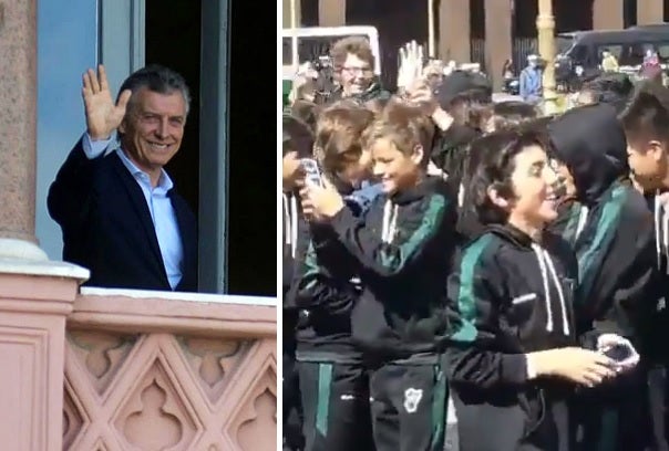 En las imágenes que duran poco menos de un minutos se puede ver a los adolescentes que están de gira por Buenos Aires, corear el nombre del presidente que sin dudar salio al balcón a saludarlo y se puede apreciar el gesto de los chicos por el gesto del presidente de los argentinos.