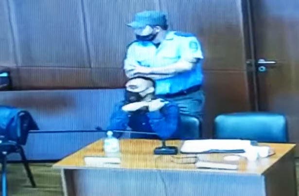El gesto que hizo el acusado quedó grabado por las cámaras del Poder Judicial. En el video puede verse el instante en que Visuara mira a Nicolás, quien además de ser hijo de Dominé es querellante en la causa, y se pasa un dedo por el cuello.