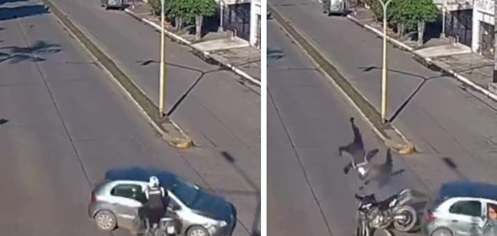 El siniestro fue captado por las cámaras del Centro de Monitoreo Municipal. En las imágenes se ve cómo el automóvil embiste a la moto, provocando la caída del policía. Minutos más tarde, el efectivo fue asistido por personal de salud y trasladado a un hospital de la zona.