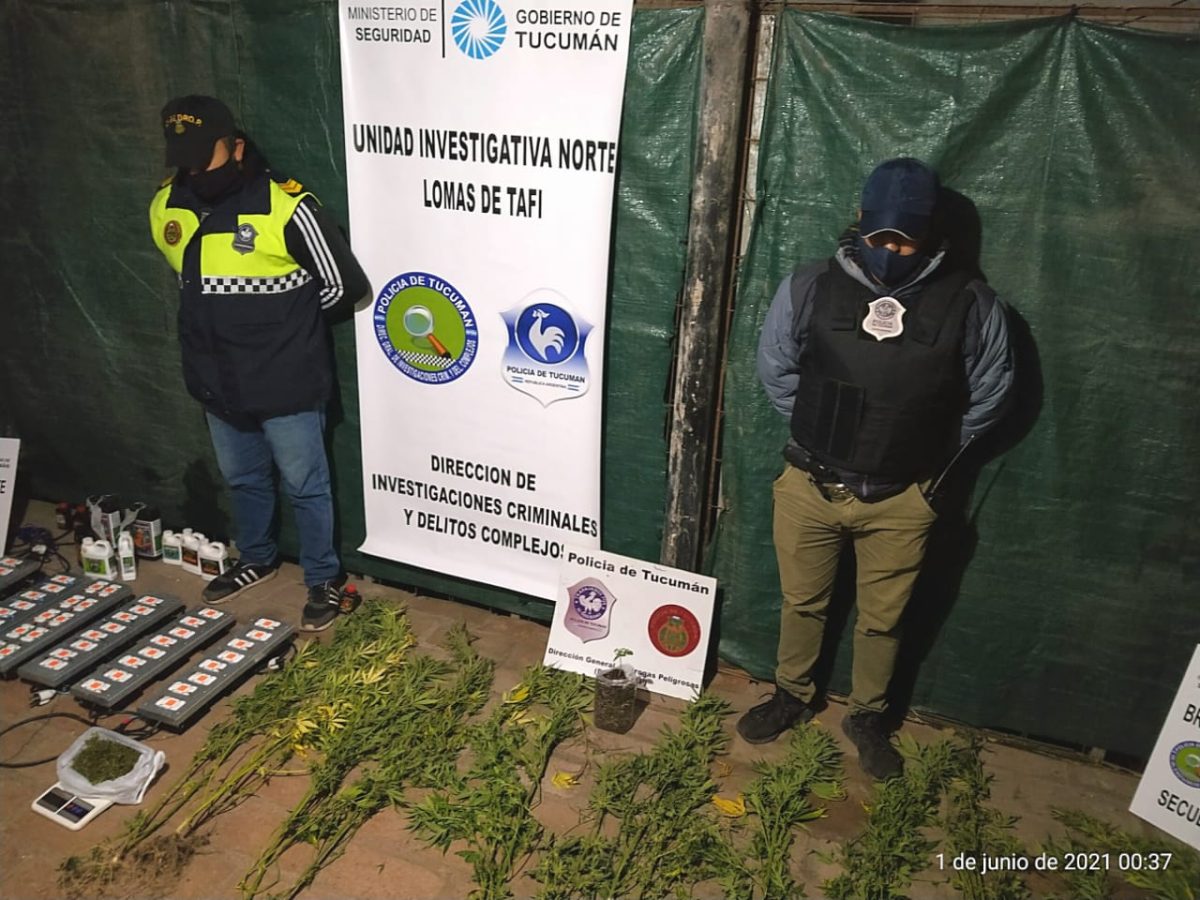 Alertados por el Sistema de Emergencias del 911 sobre un robo en banda de al menos cuatro hombres vestidos de policías federales ocurrido en Villa Carmela, los efectivos de la Unidad de Investigaciones Norte con base en Lomas de Tafí llegaron al lugar y hallaron sorpresivamente un  laboratorio con 25 plantas de marihuana, seis artefactos eléctricos Led, macetas y botes de fertilizantes. El dueño de la vivienda, apodado “Yuse”, de 27 años, quedó detenido por orden del Juzgado Federal N°1 por presunta infracción a la Ley N° 23.737 de Estupefacientes.