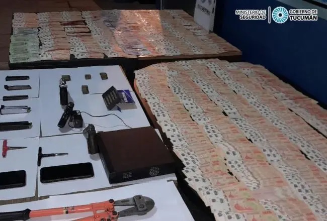 Al respecto, Morante detalló “se realizaron allanamientos simultáneos en la zona de Villa 9 de Julio, se logró recuperar 1.700.000 pesos, 210 dólares, además se secuestraron dos pistolas calibre 22 (ambas tienen su numeración suprimida) y una pistola calibre 380, así como una importante cantidad de municiones. En el lugar también se encontraron teléfonos celulares de las personas que están detenidas; hasta el momento tenemos tres personas detenidas, dos hombres y una mujer; quien sería la que habría facilitado el ingreso”, precisó.